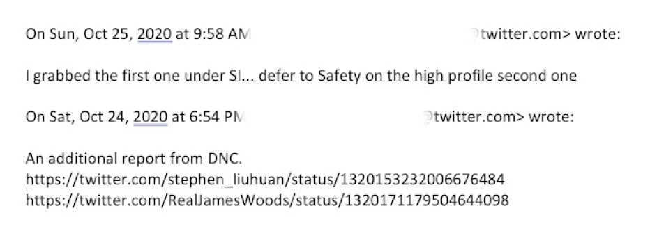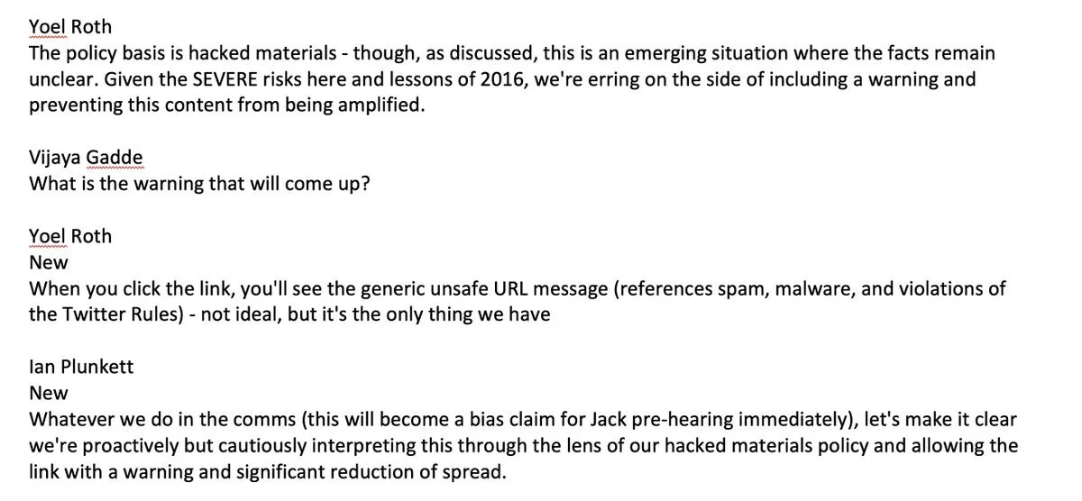 You can see the confusion in the following lengthy exchange, which ends up including Gadde and former Trust and safety chief Yoel Roth. Comms official Trenton Kennedy writes, “I'm struggling to understand the policy basis for marking this as unsafe”: