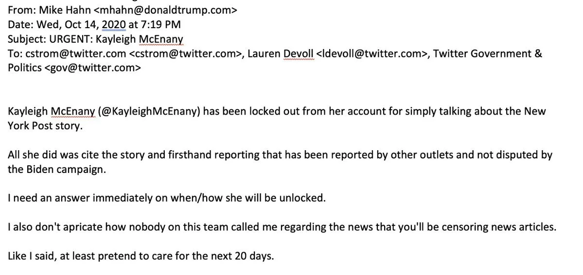 White House spokeswoman Kaleigh McEnany was locked out of her account for tweeting about the story, prompting a furious letter from Trump campaign staffer Mike Hahn, who seethed: “At least pretend to care for the next 20 days.”